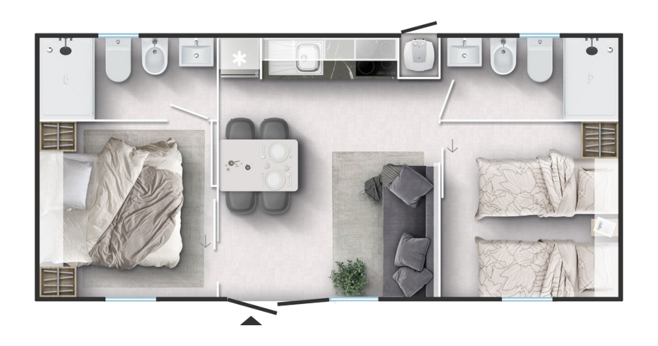 Surface area of Olive mobile home is 34,40 m2 and it’s located close to the pool complex, entertainment facilities and the restaurants. They are intended for 4 adults and 2 children up to the age of 12 . All mobile homes are completely furnished and with a spacious covered terrace. There’s a parking spot for your vehicle near the mobile home.